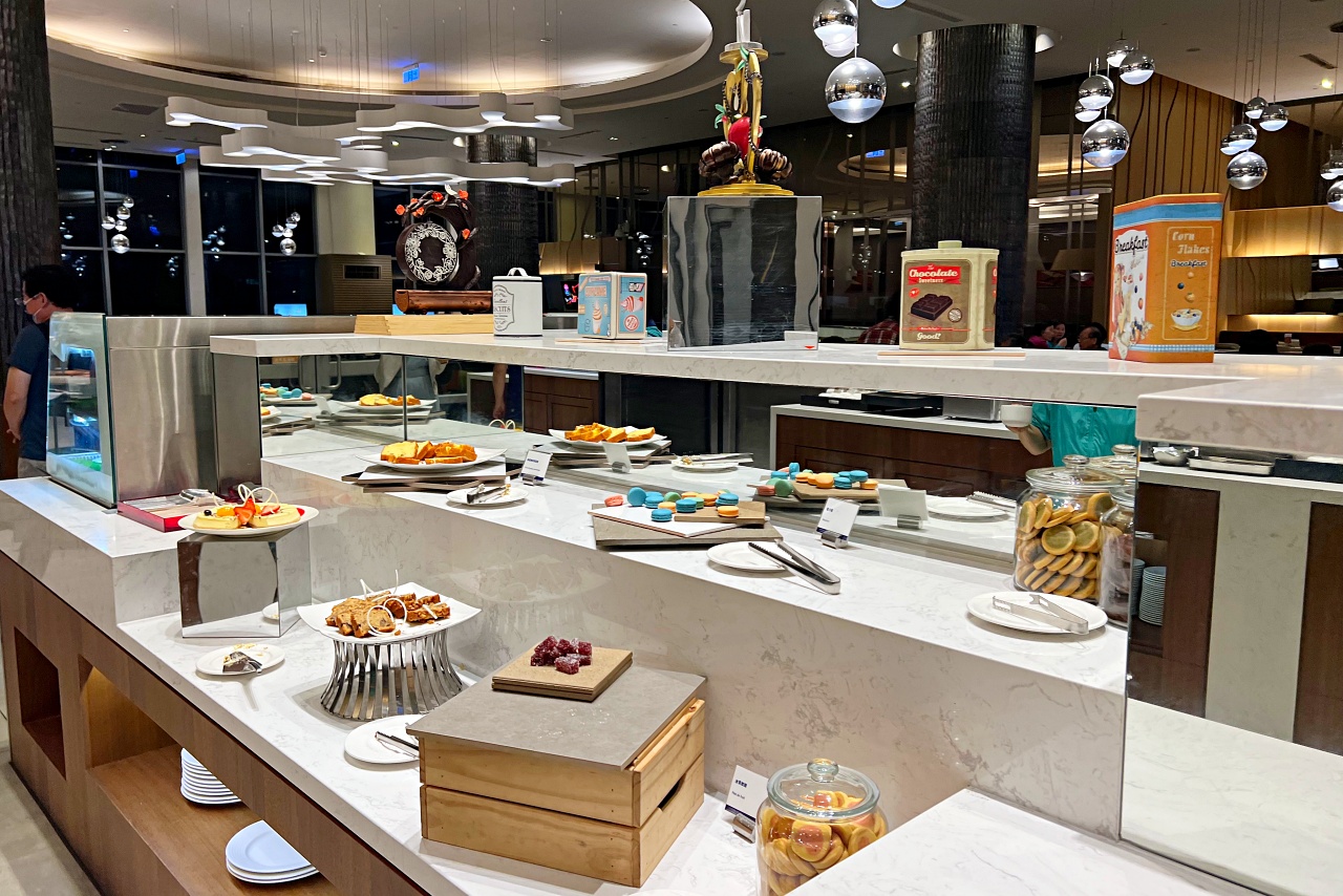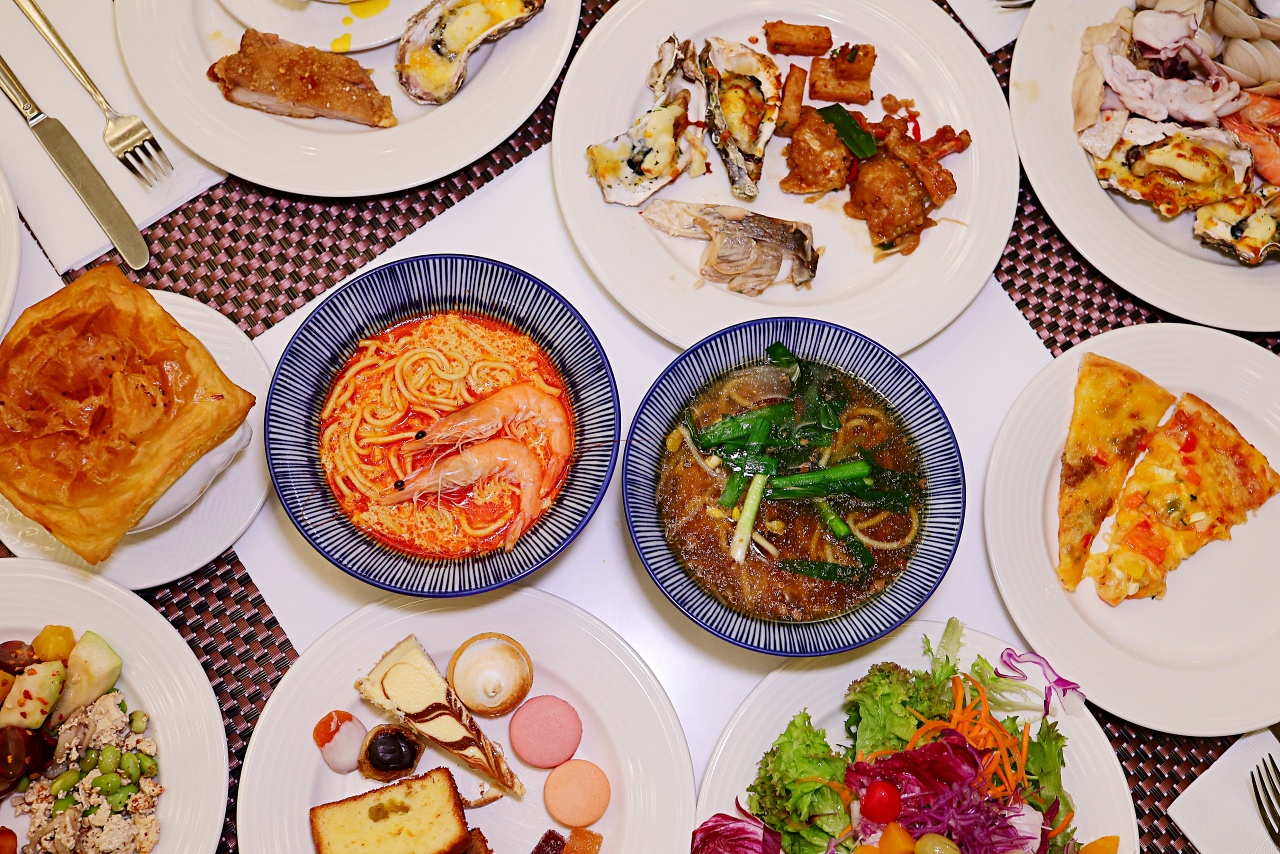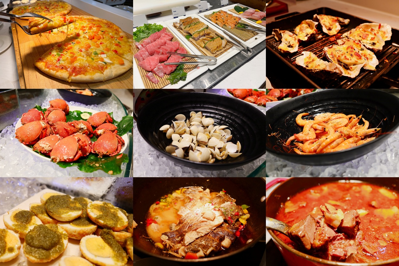 ▲餐點的供應方式屬於自助吧,菜色選擇跟豐富度不輸外面的吃到飽餐廳,餐點主題每季更新,這次剛好是4/1-5/31的「驚艷泰味」泰式料理的主題。披薩、海鮮、生魚片、泰式檸檬魚、烤生蠔,還有叻沙麵、冬蔭湯、泰式椒麻雞、月亮蝦餅、擔擔麵,看的我眼花撩亂,每一種都嚐一點。
