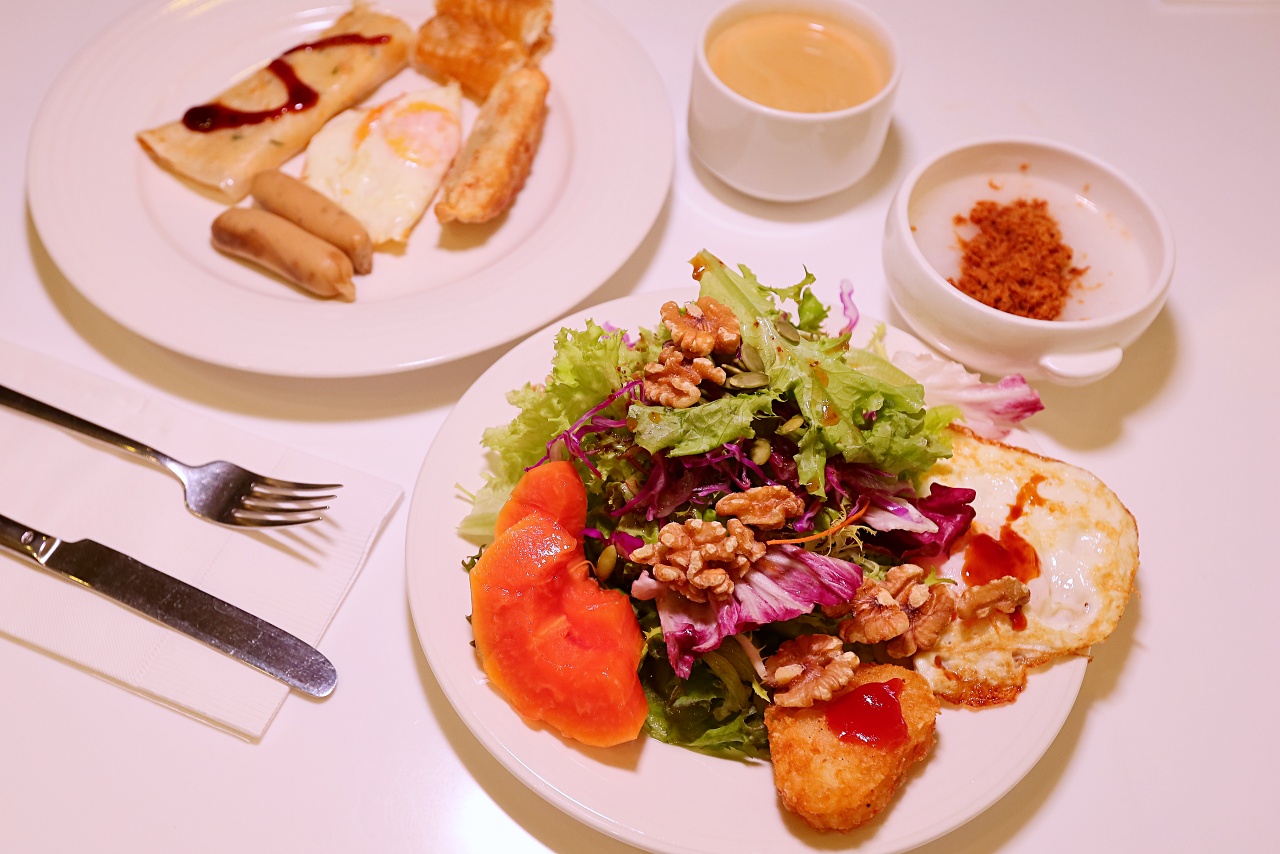 早餐的種類也挺多樣化的,比較不同的是中式餐點多一些,有台灣人喜歡的傳統早餐燒餅油條、蛋餅、豆漿、荷包蛋,跟顏色繽紛的蕎麥麵、西點麵包、玉米脆片。我很少吃早餐,這樣小小一盤就超飽的。