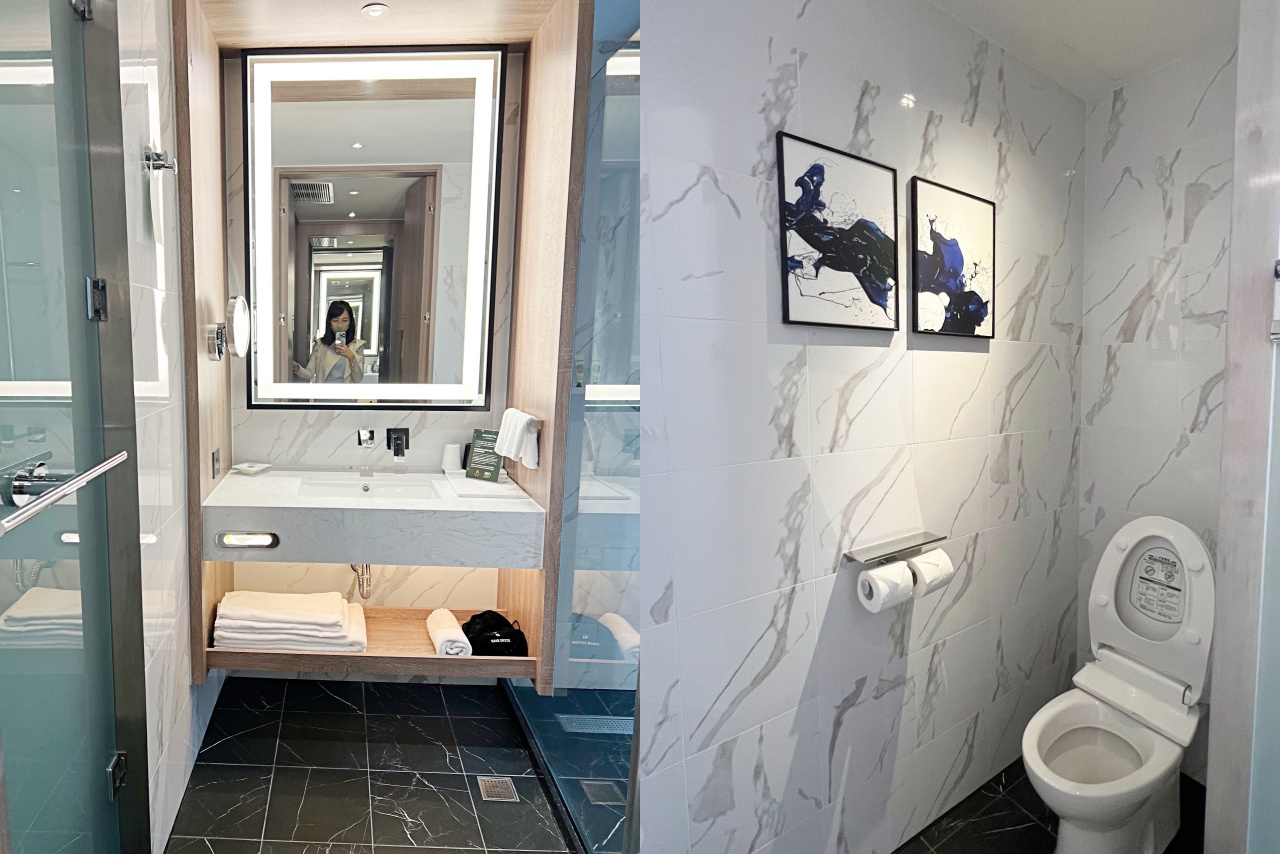 浴室貼心的乾濕分離,地板採用大理石紋路的磁磚搭配,簡單明亮的空間小巧而精緻。飯店倡導綠色環保的概念,沒有主動提供一次性備品,像是浴帽、牙刷、刮鬍刀,需要的話可以直接請room service送到房間。