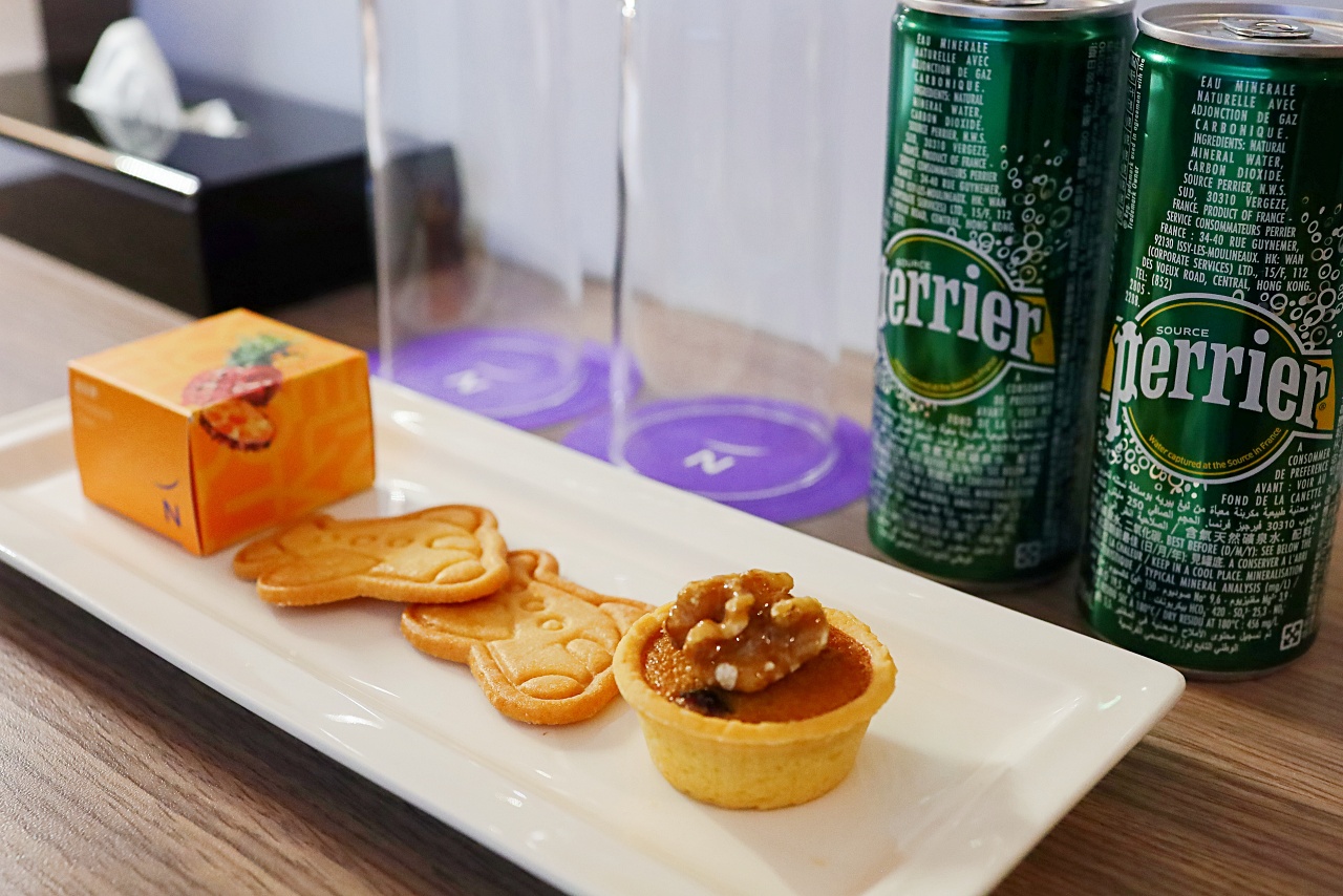桌上有個迎賓小驚喜,可愛的飛機造型餅乾、小巧的塔跟鳳梨酥,還有氣泡水,是招待媒體的小點心,目前還沒有提供給一般房客,希望未來有機會讓一般旅客都可以享用到。