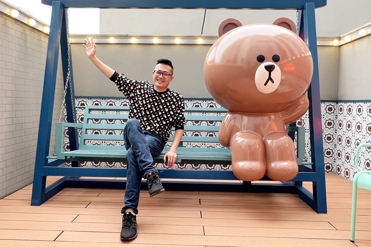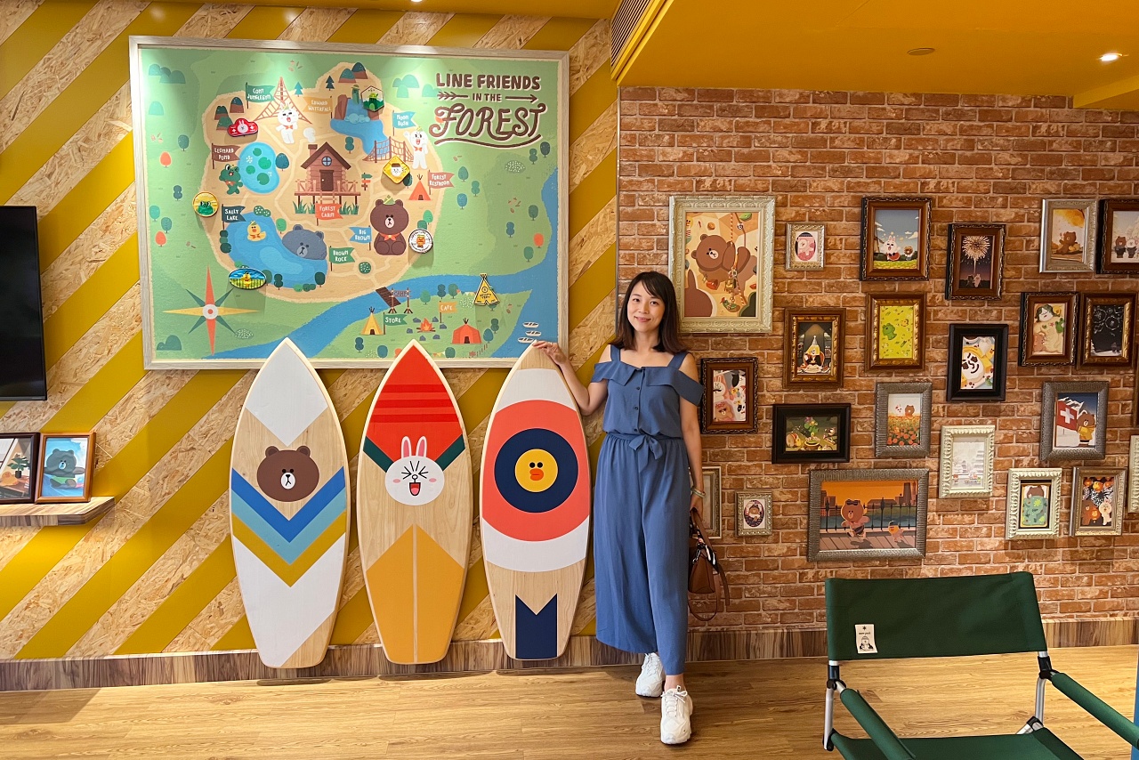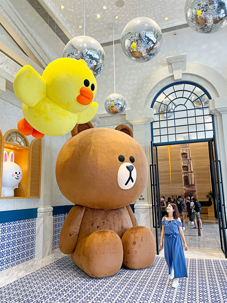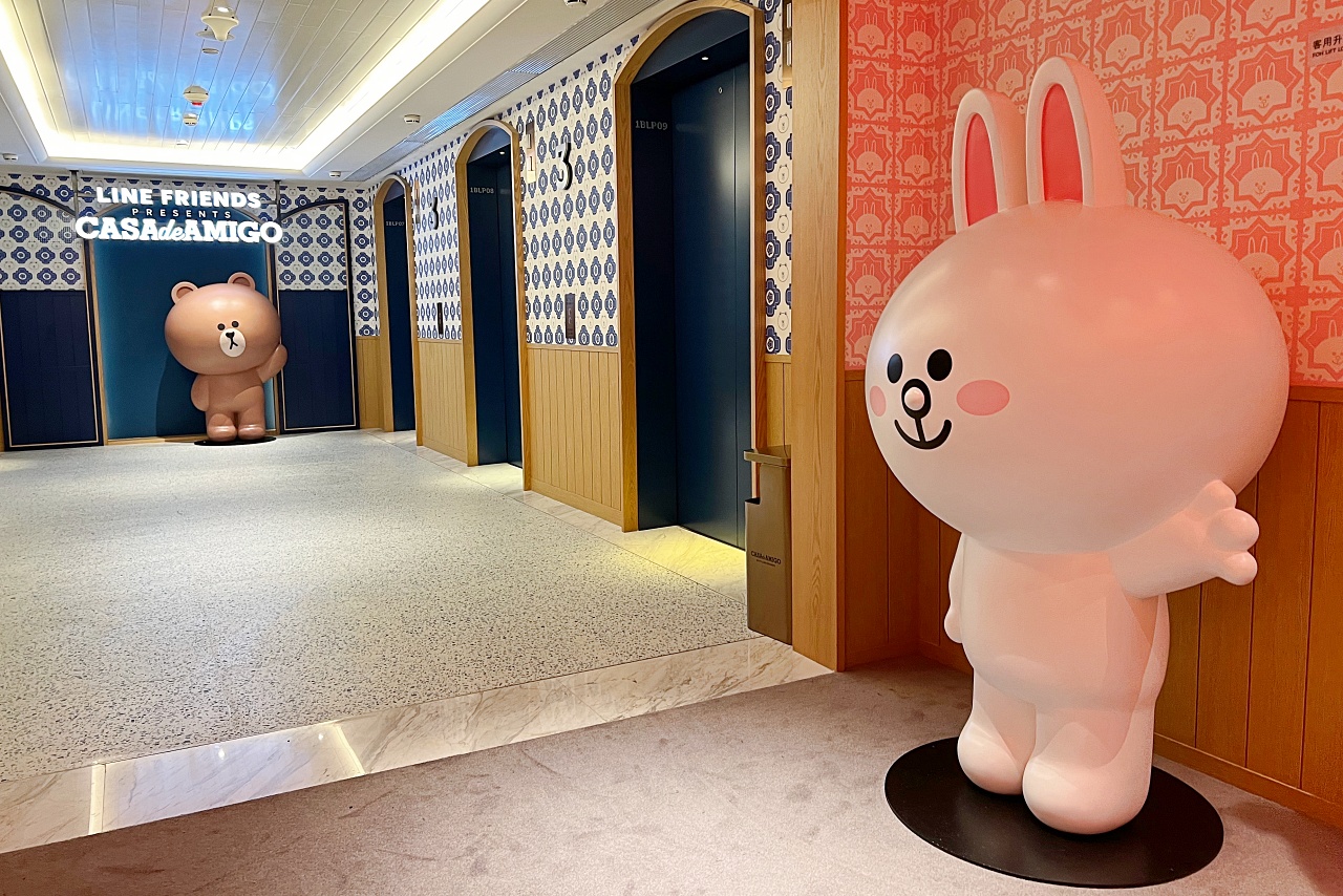 走進LINE FRIENDS主題酒店的大廳迎面而來是約莫2公尺高的憨厚熊大,還有身後正在熱烈揮手的兔兔、飛高高的沙莉。簡直是到了夢幻的遊樂園一樣,自己變成裡面的主角,從地板磁磚到天花板,都是LINE FRIENDS的元素。都還沒check in ,我們已經在大廳拍到忘我。