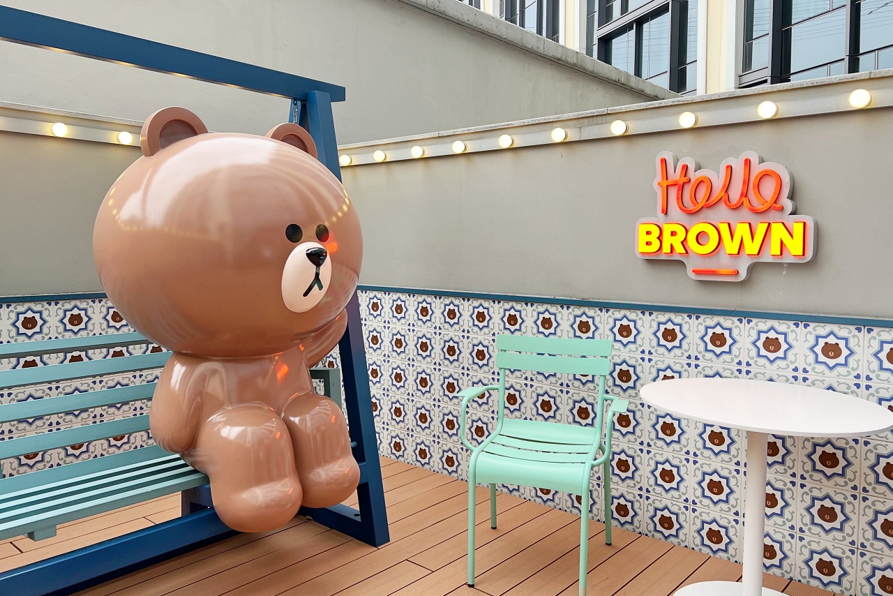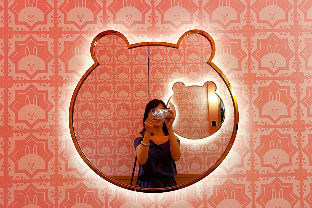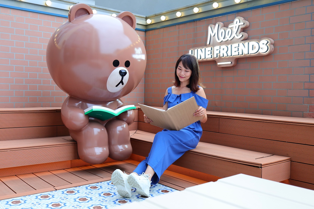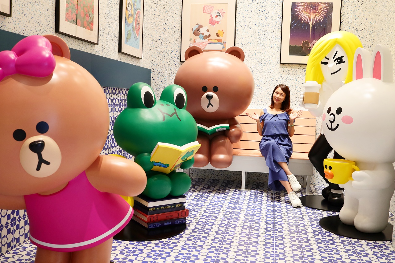 走進LINE FRIENDS主題酒店的大廳迎面而來是約莫2公尺高的憨厚熊大,還有身後正在熱烈揮手的兔兔、飛高高的沙莉。簡直是到了夢幻的遊樂園一樣,自己變成裡面的主角,從地板磁磚到天花板,都是LINE FRIENDS的元素。都還沒check in ,我們已經在大廳拍到忘我。