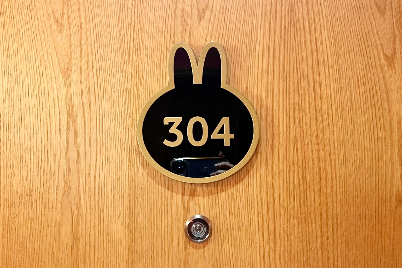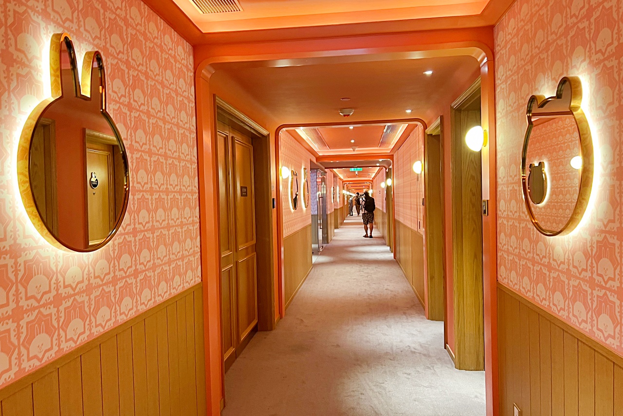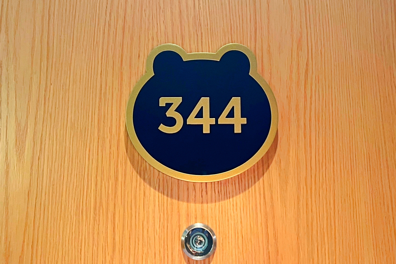 主題房的公共空間佈置從電梯打開的那瞬間就開始充滿驚喜,有電梯口的熊大、轉角處的跟兔兔,連走道延伸到牆面都是主題元素。兩側有超可愛的玫瑰金外框鏡子,是兔兔跟熊大的造型耶,超想要家裡也有這樣的鏡子。