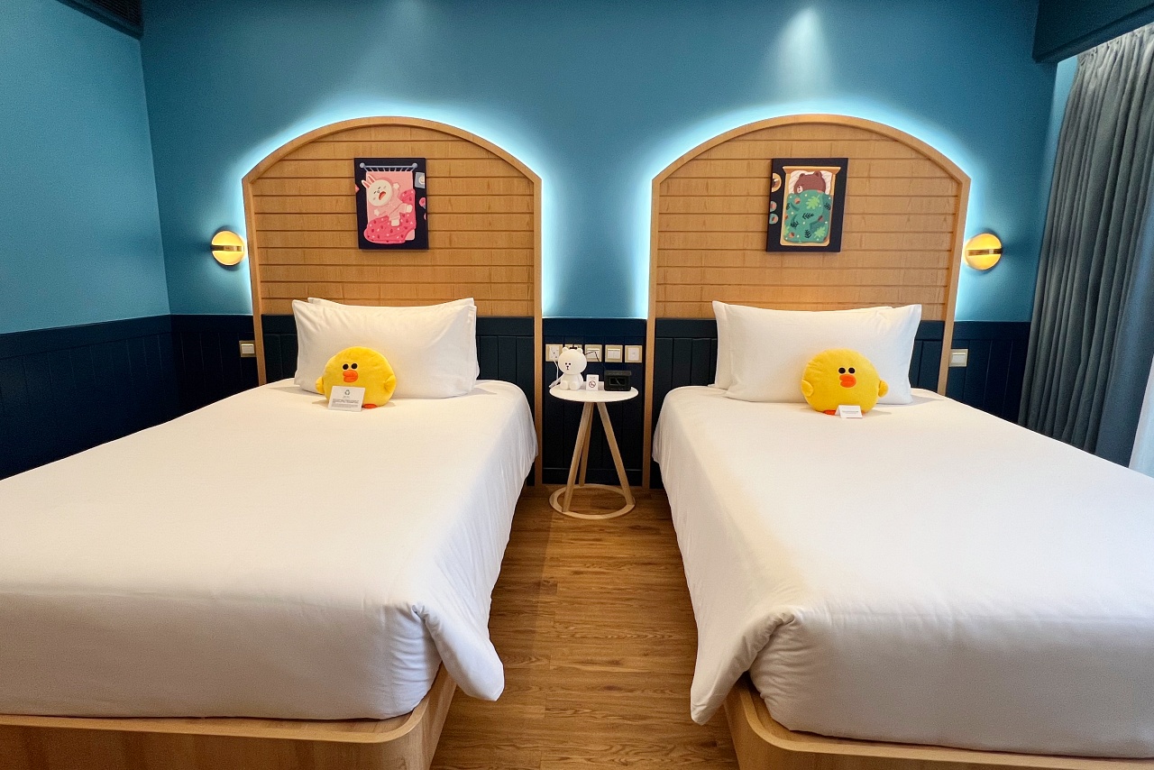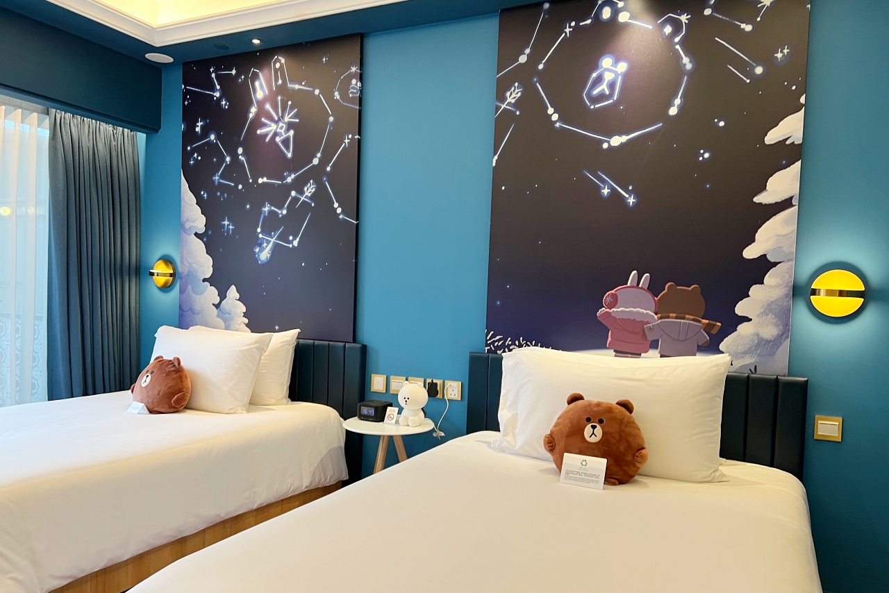 空間也是45平方米的大小,兩張單人床上擺著兩顆枕頭跟熊大抱枕,床頭櫃後方熊大還有兔兔的星座圖,兩小床的設計適合跟朋友一起入住。