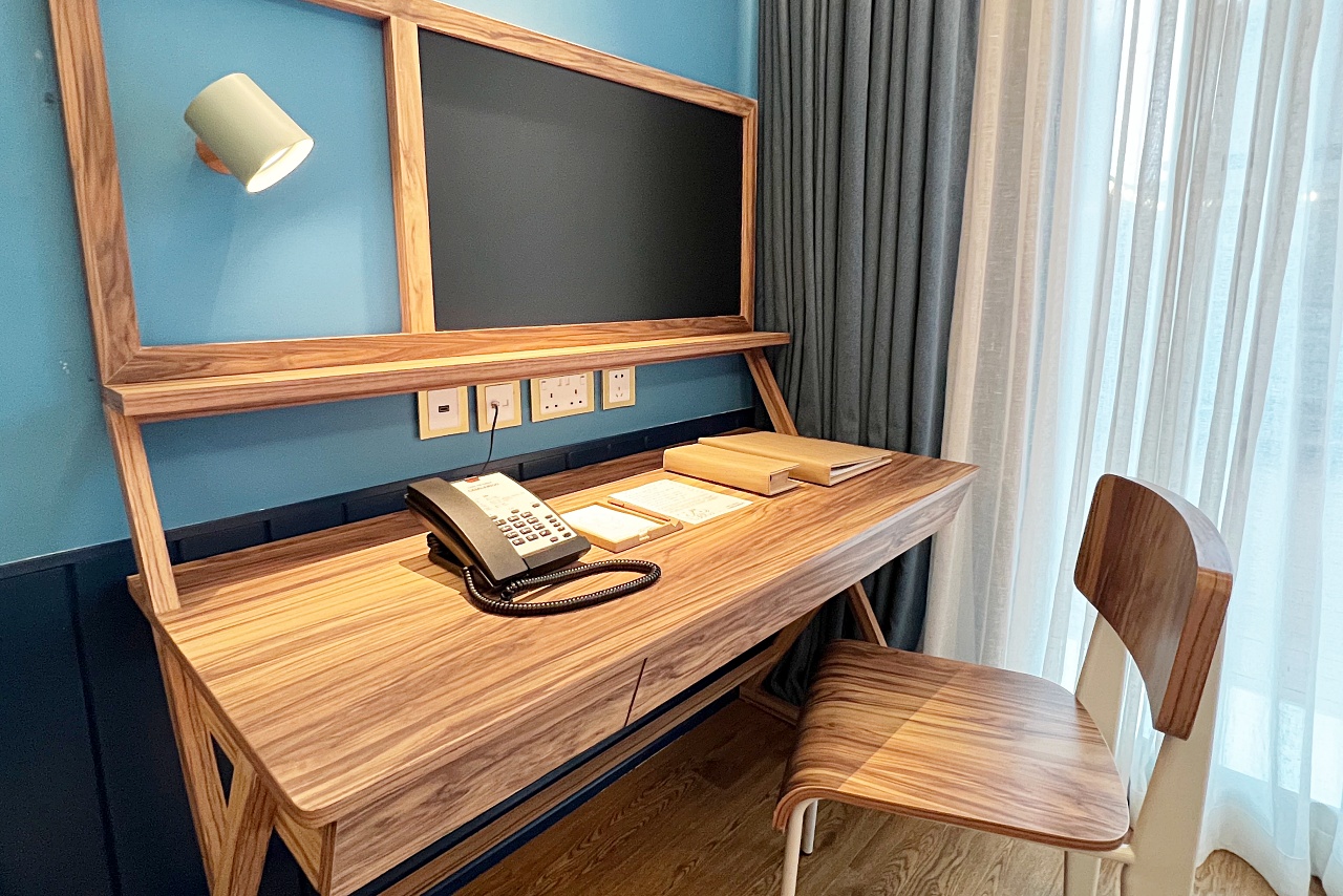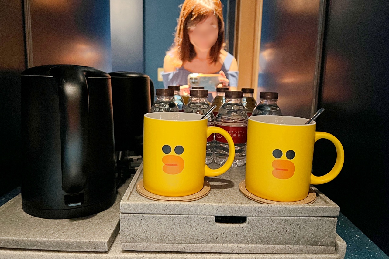 馬克杯是黃色的沙莉造型。為了滿足住客的願望,房間內大部分的商品都有提供販售,價格表就在書桌上,喜歡的直接跟櫃檯訂購就行囉。