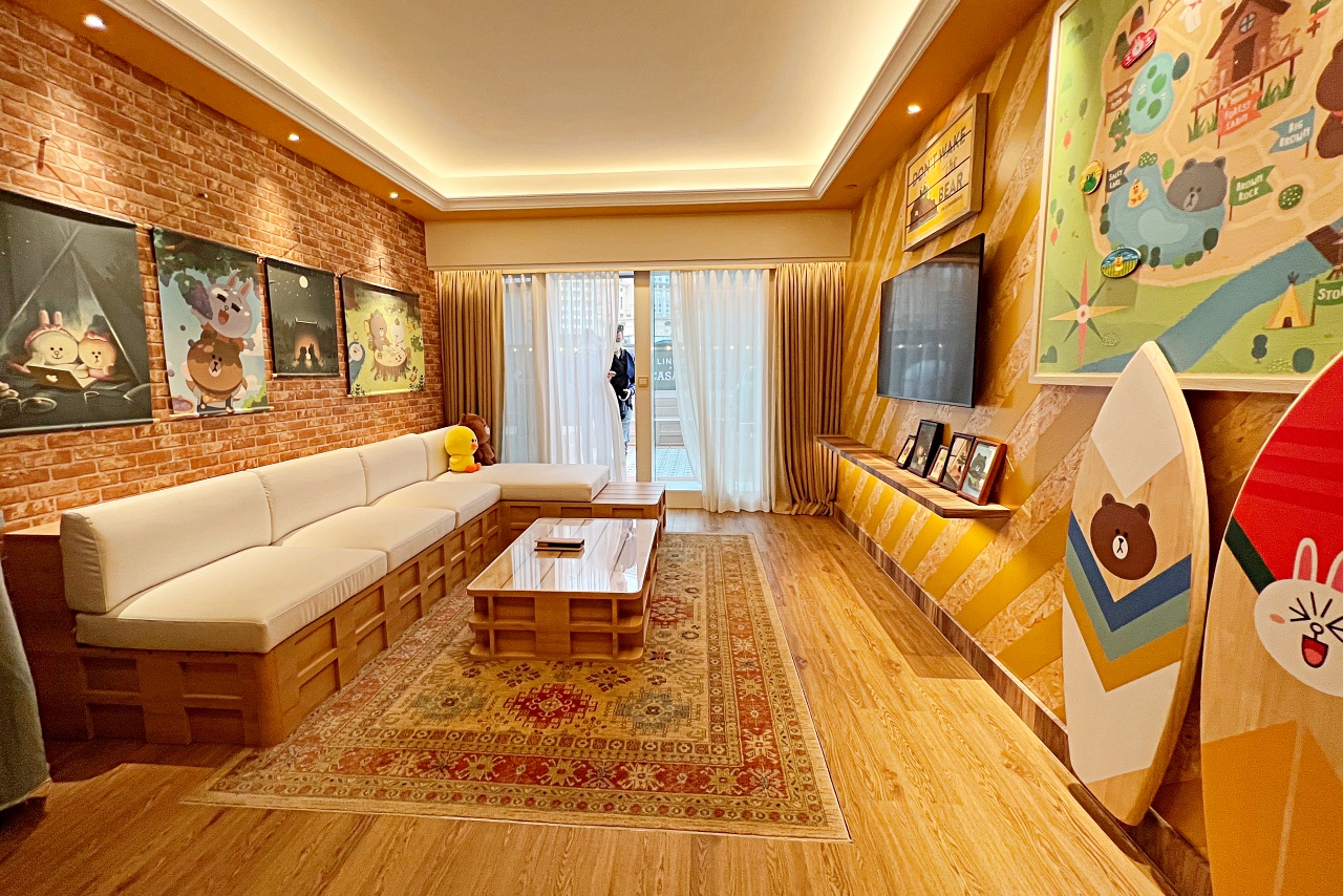 把LINE FRIENDS大集合的房型就是這間了!這間的主題房比較特別是套房式設計,足足有75平方米,有兩小床的臥室加上獨立大客廳、戶外陽台,打造成好友們一起郊遊露營的主題,更顯得歡樂無比。這間非常好拍,每個角落都變成網美拍照點了,如果是入住這間,真心建議準時check in多花點時間拍照。