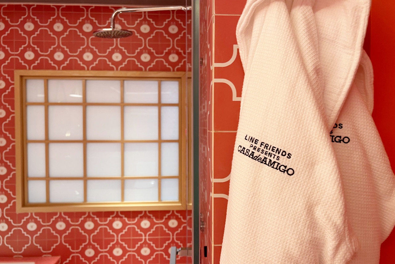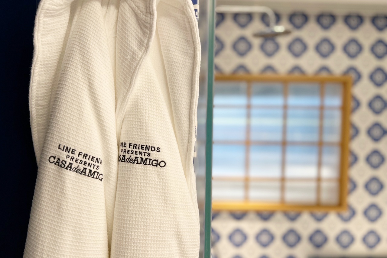 浴室的地板磁磚到牆壁磁磚,都是兔兔的logo,連浴袍都有LINE FRIENDS 主題房的文字。