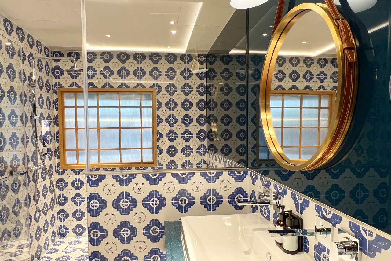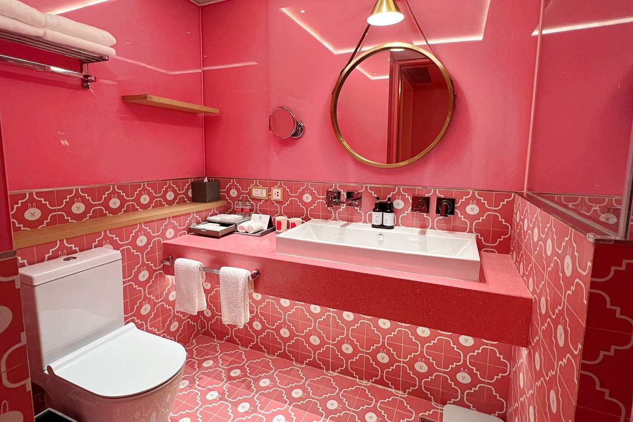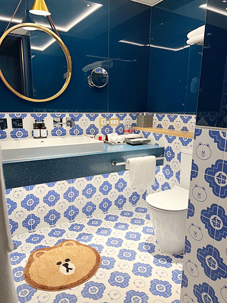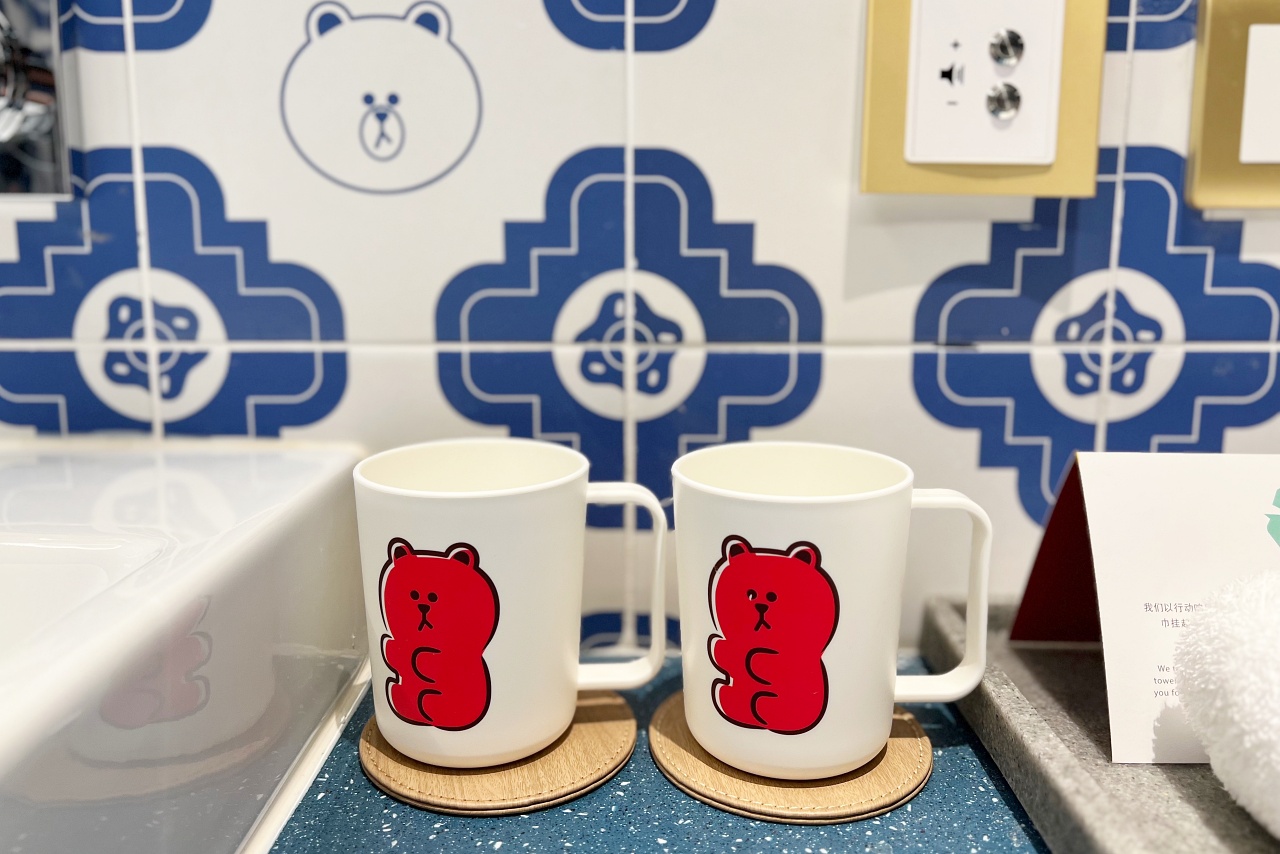 浴室的地板到牆面都是熊大磁磚打造,漱口杯、備品、浴衣都好可愛,通通都想要收藏。以藍色調跟葡式花磚風格打造的熊大主題房,不同於粉紅色系兔兔的熱情奔放,反而更顯沉穩而令人放鬆。