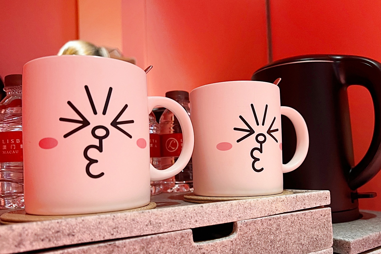 用少女新爆棚的粉紅色打造而成的兔兔主題房,相信很多女生看到都會融化的。空間有45平方米大,房間內的牆面、抱枕、檯燈、掛畫、馬克杯….每個小細節都是讓人愛不釋手的主題小物。沒想到漢斯先生也覺得兔兔房很可愛耶,如果是親子客入住,小朋友肯定玩翻。