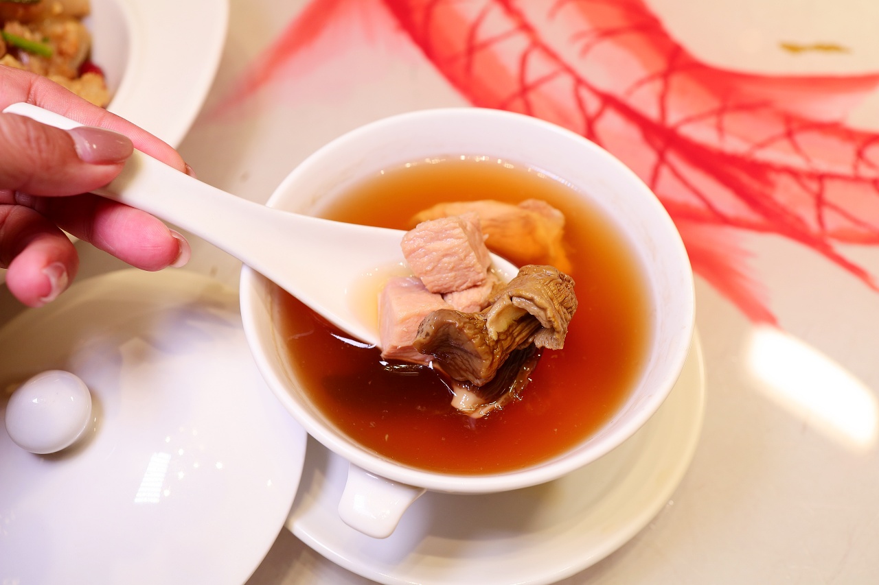 營養價值高的姬松茸加上雞肉、鮑魚一起燉煮,湯頭呈現出紅褐色,濃郁的菌菇香中帶著清甜感,喝完瞬間開胃。