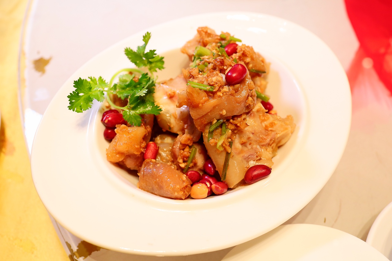 在茶樓很容易吃到的料理「沙薑豬手」,把薑片、蔥段、鹽等調味料跟豬腳一起燉煮,煮熟後再放進冷水冰鎮,淋上沙薑醬汁,就成了清爽的豬腳料理,口感Q彈,完全不油膩,平常不愛吃豬腳的朋友也被收服了。