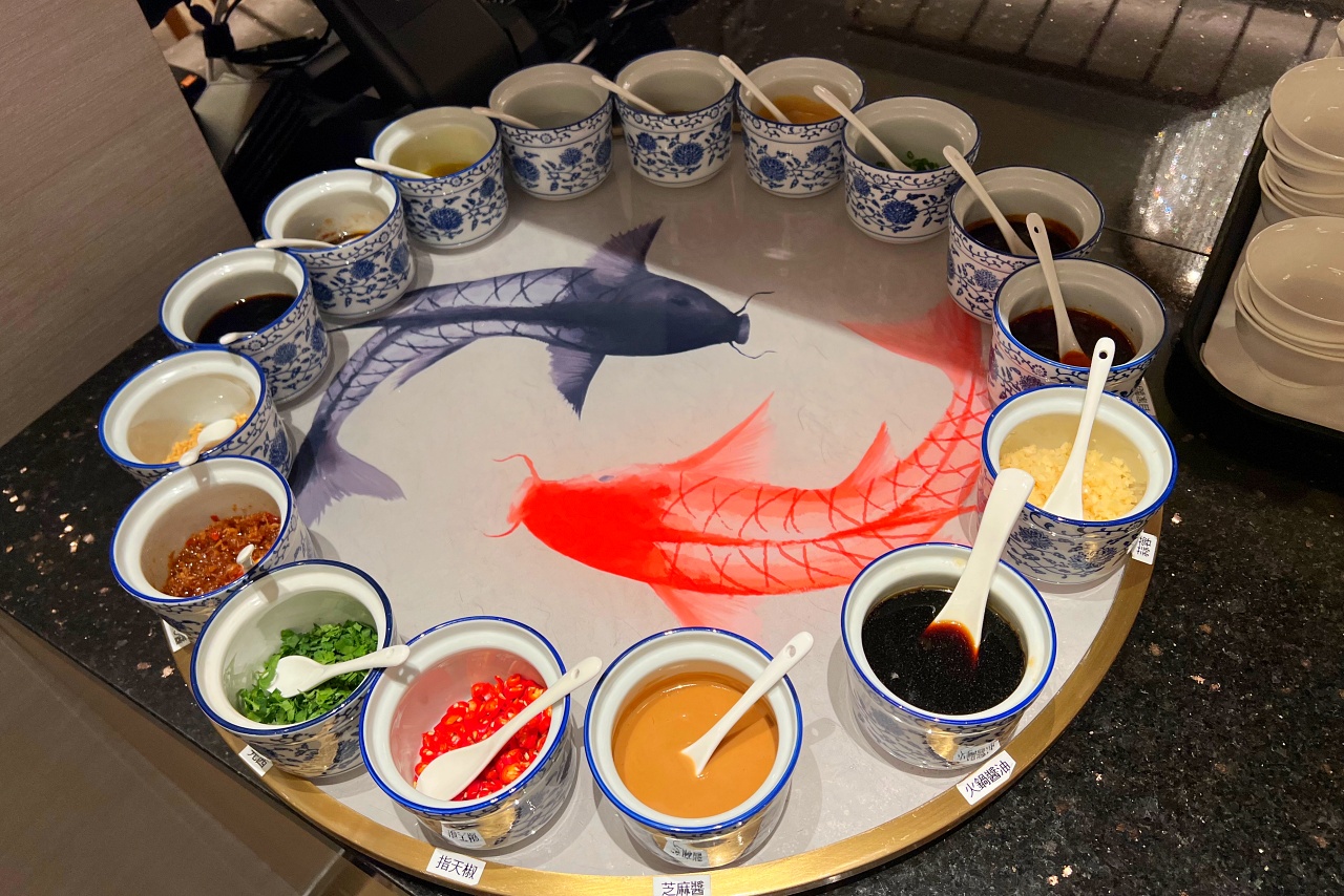 底部畫有兩條鯉魚的圓形醬料轉盤上提供多種風味的醬料。