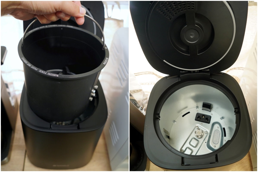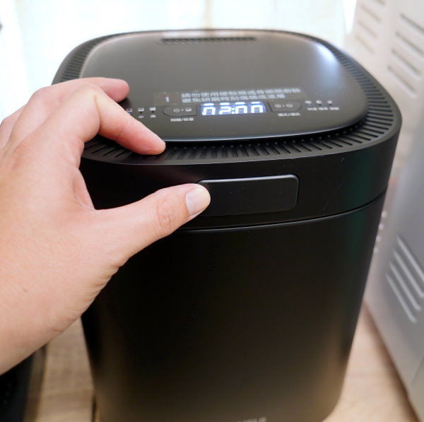 ▼機身前方有一個按鍵,一按就能輕鬆開蓋,而且還是90度打開,更方便倒入廚餘或是取出內桶!