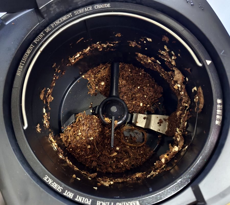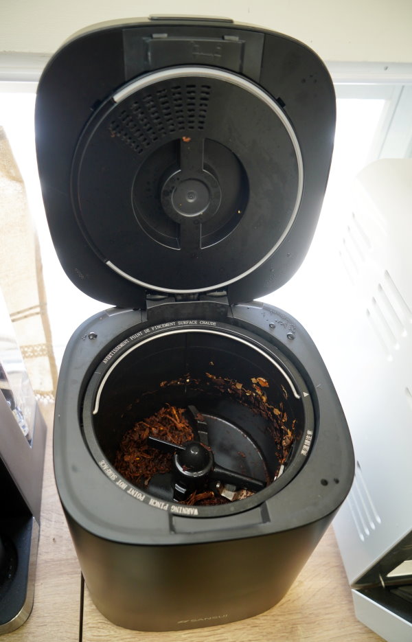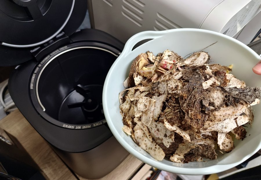 ▼SANSUI 山水廚餘機特別在於它有獨家的發酵模式,採用低溫研磨將果皮殘渣變成有營養價值的堆肥,我們剛好陽台有種一些香草植物、蔥、水果等,可以拿來施肥也不錯!首先將馬鈴薯皮、不小心放到發霉的黑木耳、花椰菜梗丟下去,依容量大小也有不同的發酵時間,這次花的時間為12小時左右,大家可以像我們一樣晚餐後開始作業,一覺醒來後就差不多完成了!