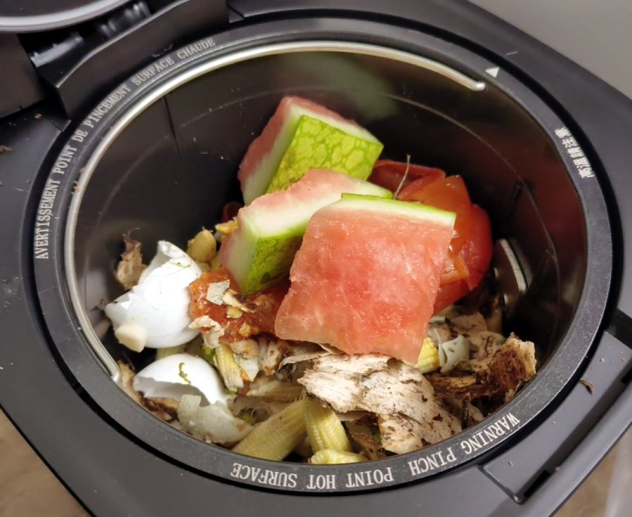 ▼接下來來試試快速模式,將削好的芋頭皮、壞掉的玉米筍、西瓜皮、蛋殼等通通放進去,大份量的廚餘也可以處理得很輕鬆!