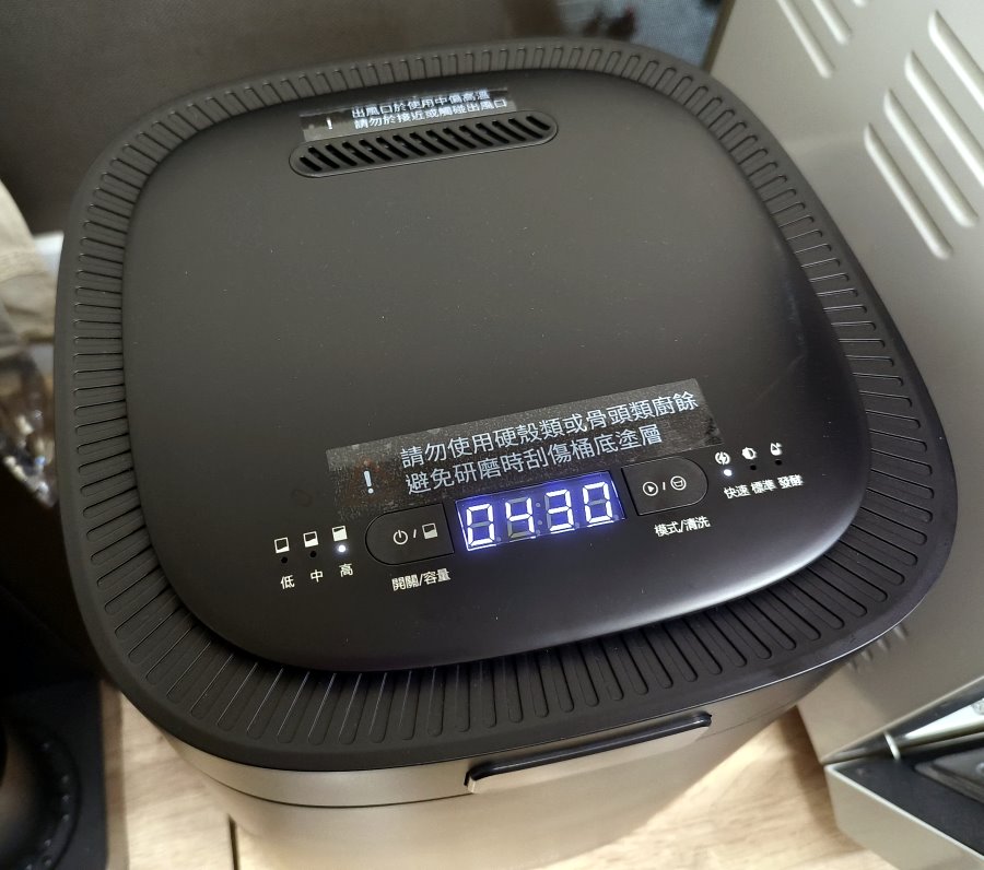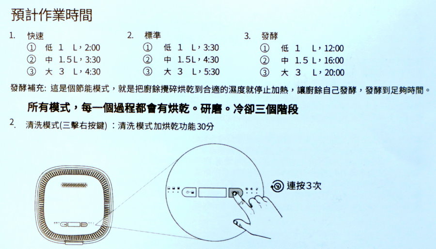 ▼面板操作也很簡單直覺,只有左右兩個按鍵,左鍵是開關跟容量,可以依廚餘多寡選擇低、中、高;右鍵則是工作模式跟清洗功能,可以選擇快速、標準、發酵,如需清洗則是連續短按三下右鍵即可進入30分鐘的自動清洗模式!