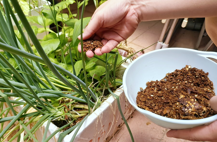▼這時候就可以拿著發酵過的廚餘來到我們的快樂農場,在蔥、水果、香草植物上頭加一點用廚餘製成的堆肥,讓植物們都能長得又好又漂亮,就可以少去很多趟市場啦!