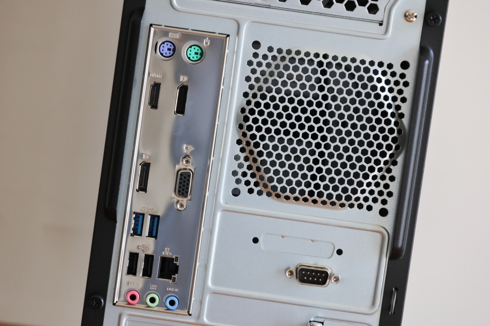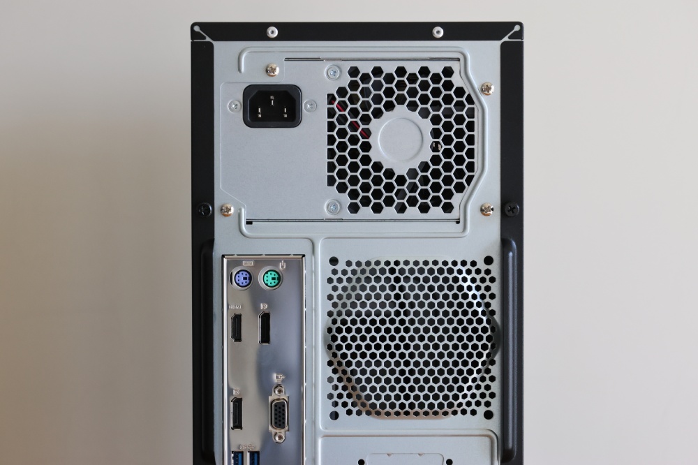 機身後方則有傳統的 PS/2 滑鼠、鍵盤連接埠、HDMI、DP、VGA、RJ-45 網路孔、USB 3.2 Gen1、USB 2.0 以及三個音源孔,可靈活搭配其他企業常用的周邊配備,像是外接螢幕、投影機或是其他設備使用,如果有需要也可以選配無線連接功能,提供 802.11ax(Wi-Fi 6)和藍牙 5.0 的連線規格。