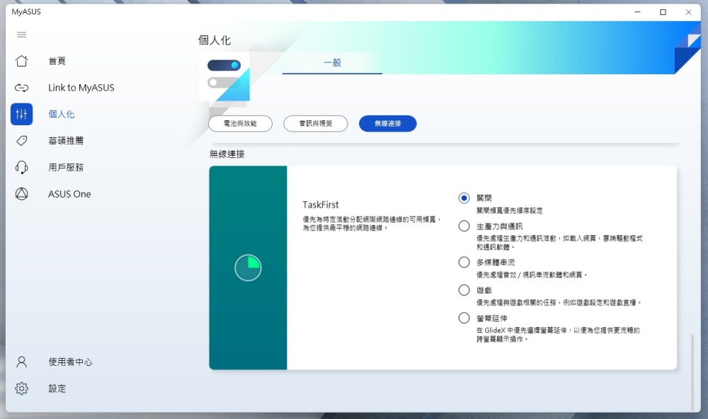 在 MyASUS 個人化介面中,還可以選擇優先任務,例如讓網路優先分配給生產力和通訊軟體,或是將優先權提供給螢幕延伸或多媒體串流等,來讓不同任務達到最高效率的產出。