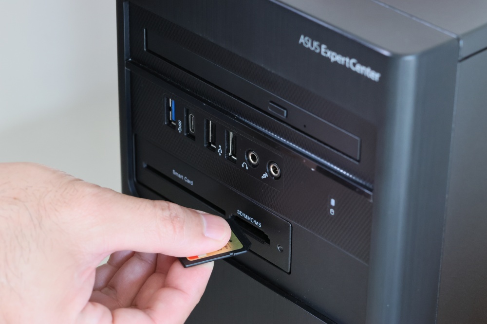 機身連接埠也是少見的完整,正面機殼提供企業可能需要但目前已少見的光碟機(選購)、USB 3.2 Gen1、USB 2.0、USB-C 連接埠、耳機孔、麥克風孔、SD 卡以及智慧卡讀卡槽(選購),不用額外準備擴充 HUB 線材或是讀卡機,就可以滿足大部分的連接需求。像是公司系統可能會需要讀取員工證作為識別,或是在使用金融機構的服務時需要讀取健保卡、自然人憑證、信用卡、金融卡等,都可透過智慧卡槽讀取。