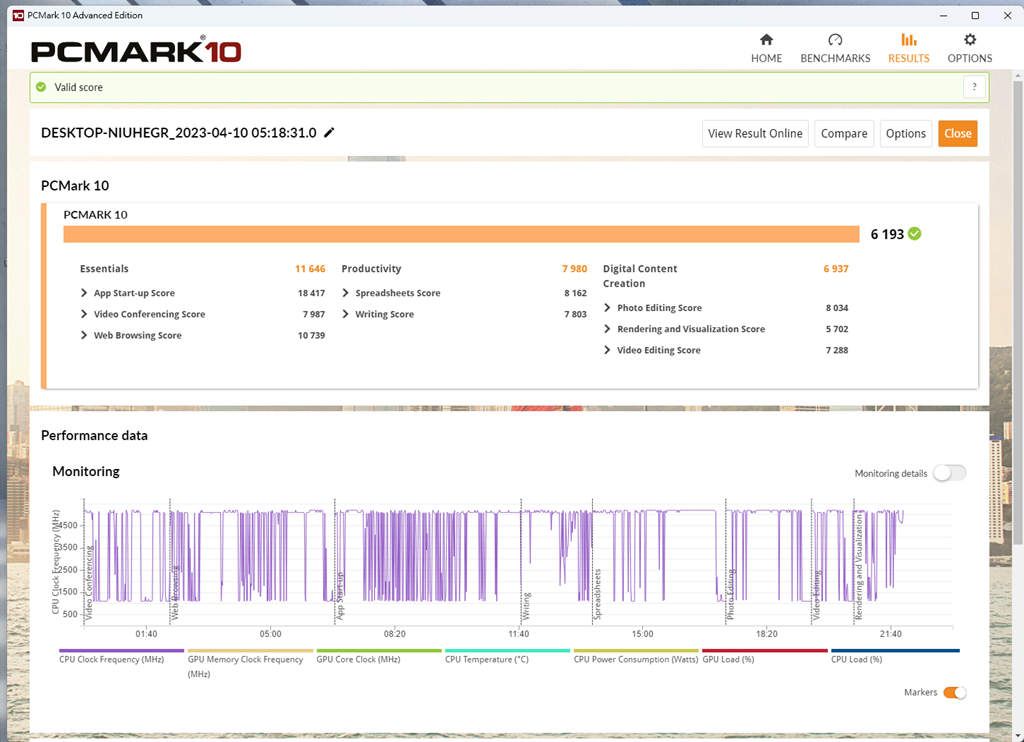 在 PCMark 10 測試下得到 6,193 分的成績,跑分過程中風扇音量不會太大,可以專注在工作上不受干擾,Essentials 分數為 11,646 分、Productivity 分數為 7,980 分、Digital Content Creation 分數為 6,937 分,各項細部分數表現都滿不錯的。