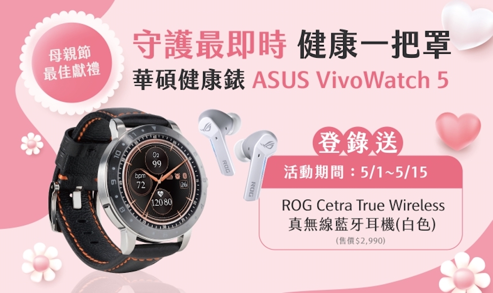 母親節感恩回饋,即日起至 5 月 15 日以前,凡於各大電商平台及實體通路購買 ASUS VivoWatch 5 智慧健康錶,並至官方活動網站完成線上登錄,再送價值 NT$ 2,990 的潮流 ROG Cetra True Wireless 真無線藍牙耳機。