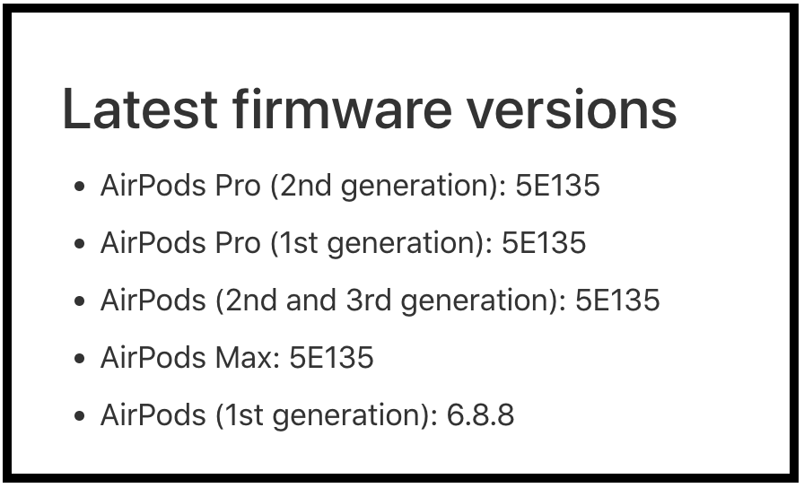 Apple 宣布向 AirPods 2、AirPods 3、AirPods Pro 1、AirPods Pro 2 及 AirPods Max 推出 5E135 全新韌體版本,不過目前還無法得知此次版本明確更新內容有哪些,但官方有表示會提供錯誤修正與其他改進項目。