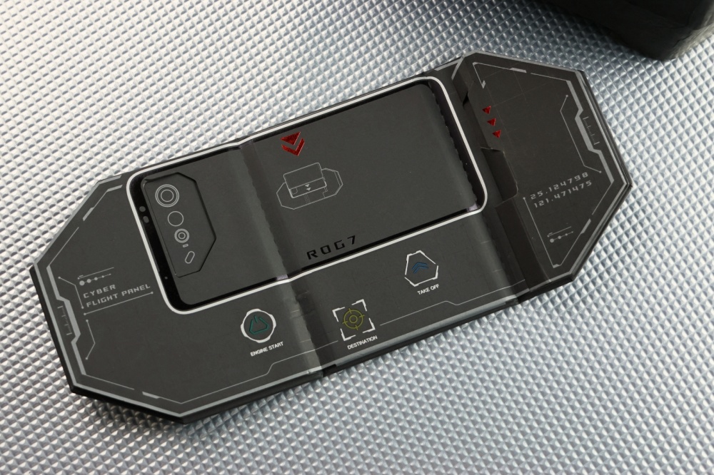 前面提到 ROG 團隊在外包裝上藏了許多巧思,其中一個就是包裝上的「釦環」,取下後攤平放置,在把 ROG Phone 7 Ultimate 放在上面,就可以透過內建的小遊戲快速了解 ROG Phone 上的功能按鍵,以這樣的方式來引導使用者入門還滿有趣的。