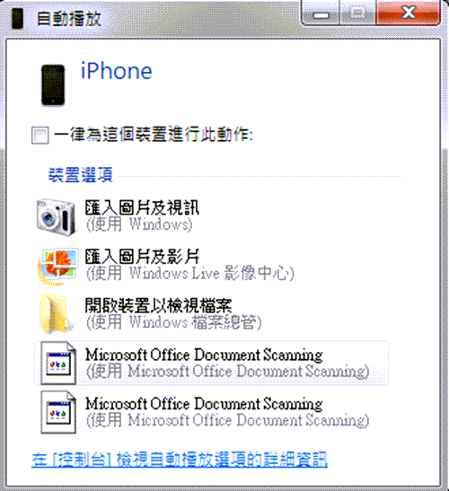 步驟1:使用 USB 數據線將 iPhone 連接至電腦後,電腦介面將會彈出新的「自動播放」視窗。