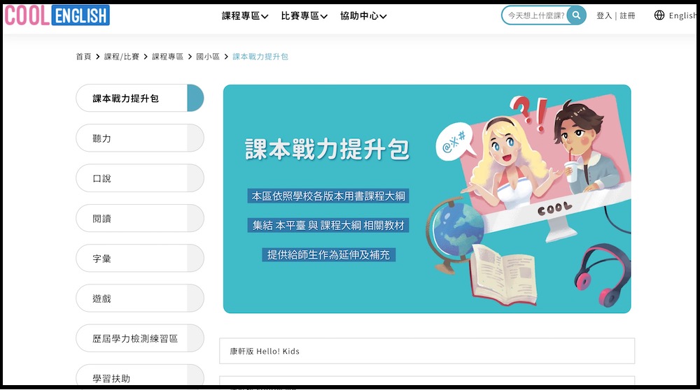 1、Cool English 網站上方「課程專區」中選擇想要學習的範圍。這邊我們如果是要為小學生孩子準備,那麼就可以選擇國小區。