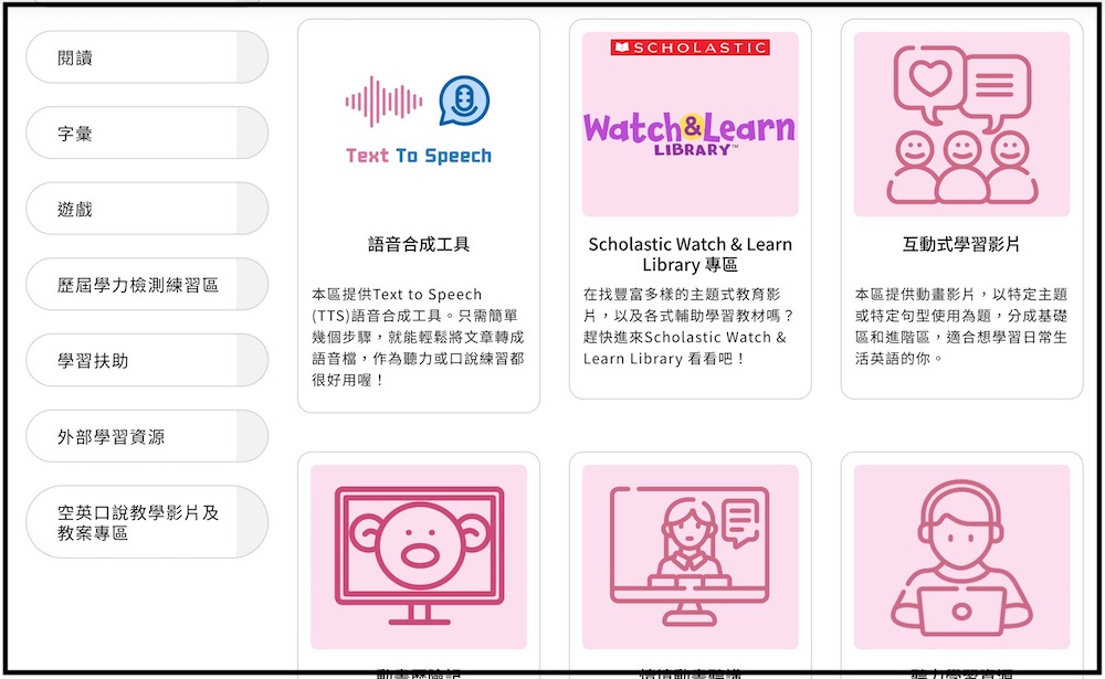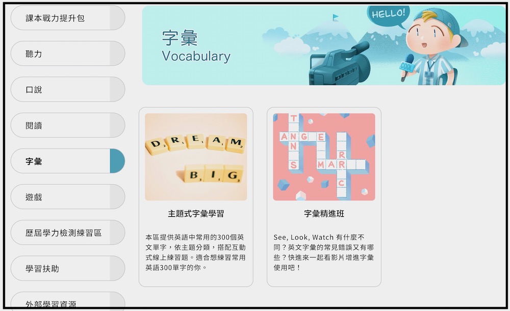 、普高與技高範圍,以及課本內容加強、聽、說、讀、寫能力等,甚至還能透過小遊戲來提升對英文的學習興趣。