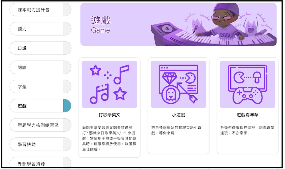5. 除了每個主題練習後都有小測驗能夠讓孩子藉由複習來累積時數、獎勵兌換獎狀抽小禮物外,也有提供小遊戲分類區來讓孩子在遊戲中學習。