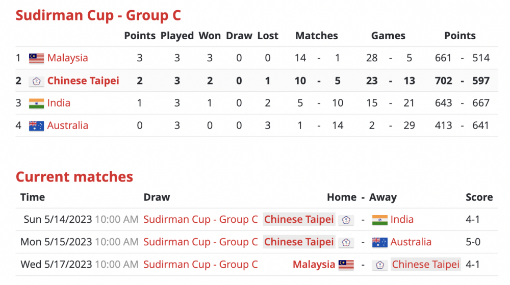 2023 蘇迪曼盃小組賽 C 組賽程、比分、轉播資訊整理 台灣好手戴資穎、周天成領軍參戰