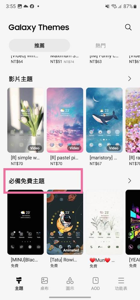 步驟 2、在這個主題區有著五花八門、琳琅滿目的風格主題,下方也都會顯示對應需要價格。這時我們將畫面滑呀滑到底,就會看到「必備免費主題」,這就表示在這區裡面的主題都是免費就可以下載的!