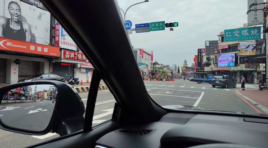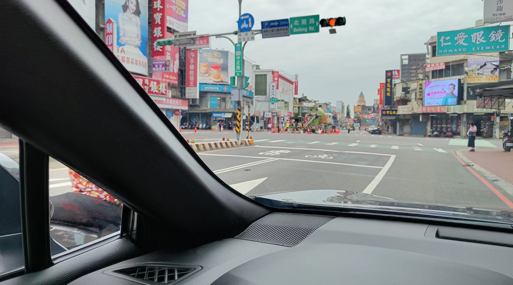 駕駛者背部離開椅背,身體往前,A柱後方的路牌一清二楚。