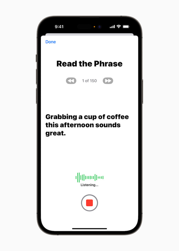使用者可以透過讀出一系列隨機文本提示,在 iPhone 或 iPad 上錄製 15 分鐘的音訊,製作出一個「Personal Voice」。這項語音輔助使用功能利用裝置端機器學習,確保使用者的資訊私密而安全,並與「Live Speech」流暢整合,讓使用者能在與親朋好友連結時使用自己的「Personal Voice」。