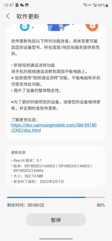 根據分享的截圖這次更新的大小大約 362MB,包括有 2023 年 2 月的安全問題修復,但真正重要的是新功能,此次更新將會允許 Galaxy S23 系列的用戶在視訊通話期間能夠順利切換到平板的螢幕繼續進行視訊通話。