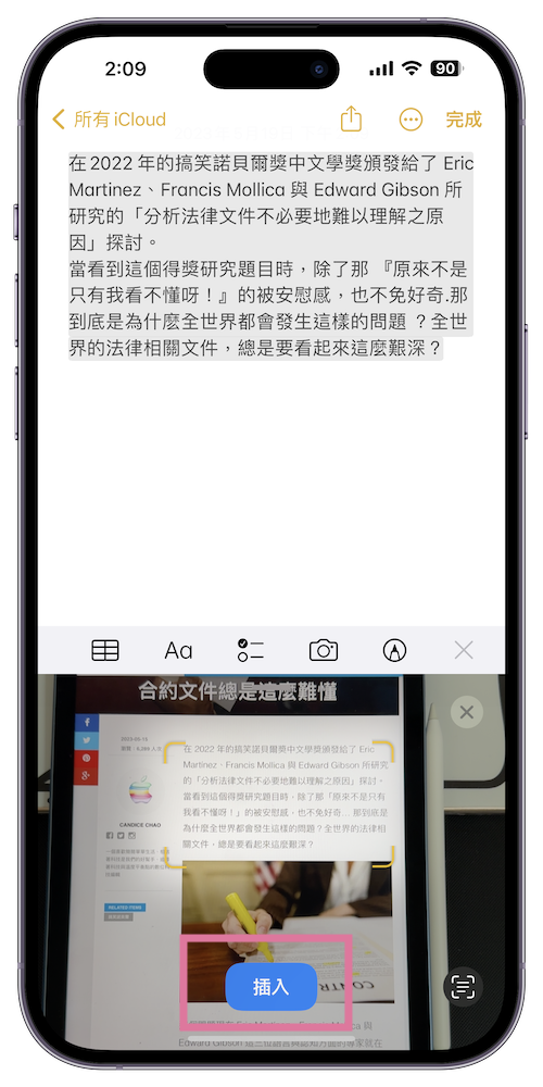 步驟 2、將鏡頭對著想要掃描到備忘錄的文字,就會看到已經自動匡列出文字並且出現在備忘錄上,接著我們只要按下「插入」便能讓剛剛那段文字確認進去備忘錄裡。