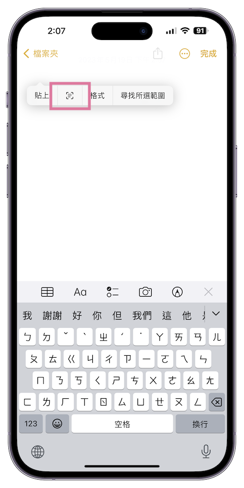 步驟 1、在 iPhone 中打開備忘錄,選擇新增備忘錄,在空白處長按後選擇第二個圖示。