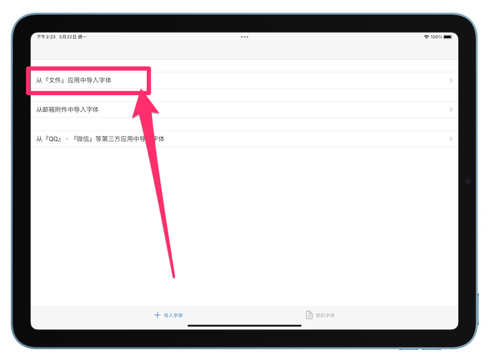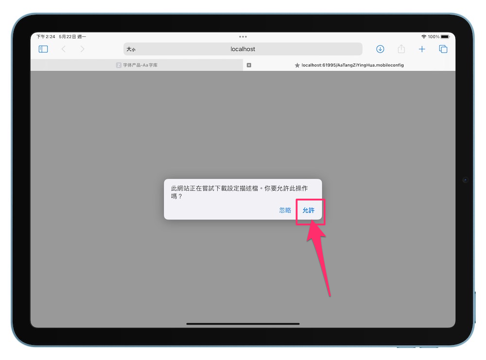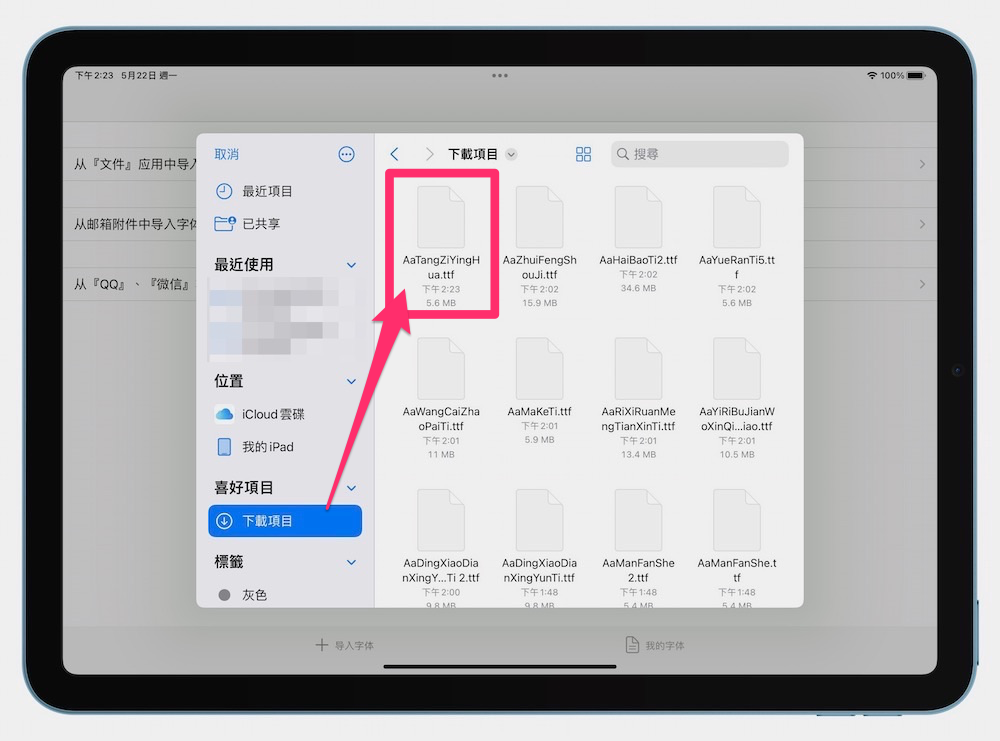 打開 iFont app 後選擇「從『文件』應用中導入字體」,挑選「下載項目」裡剛剛下載的字體點下,會出現「此網站正在嘗試下載設定描述檔」,選擇「允許」。