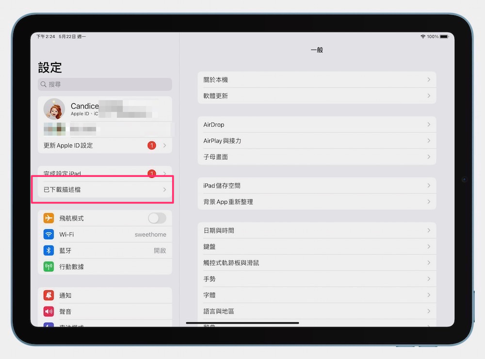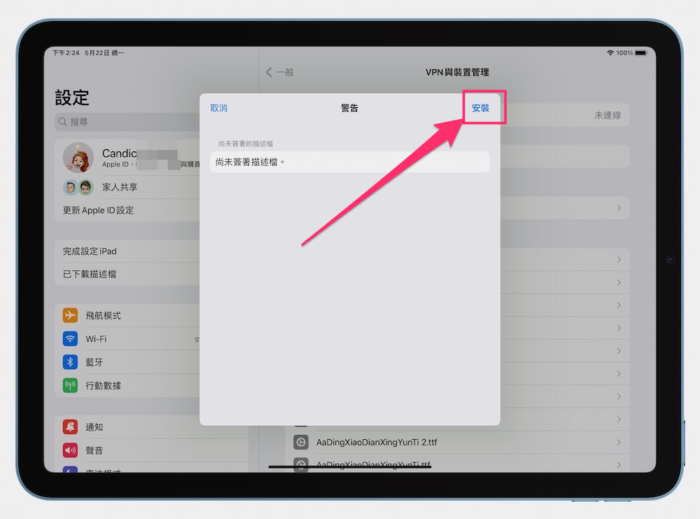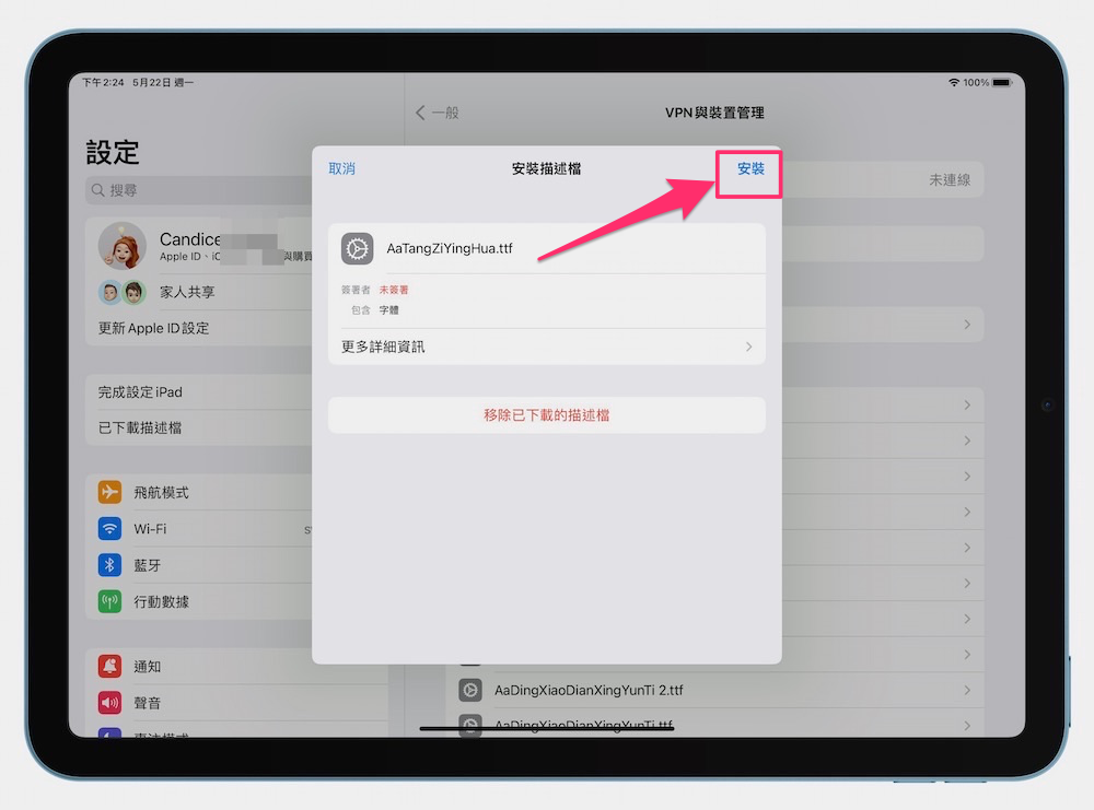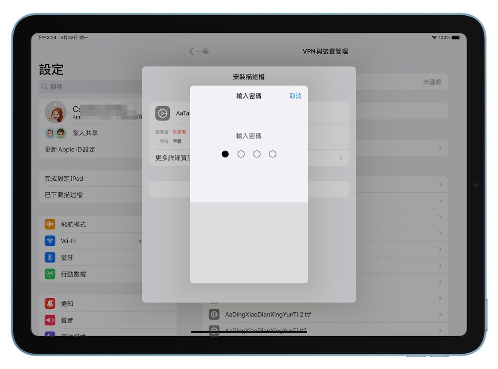 打開 iPad 中的「設定」,會在左邊欄位看到多出一行「已下載描述檔」,點選後會出現剛剛所允許的字體檔案,按下右上方的「安裝」,再輸入密碼、再選擇「安裝」,就會出現「完成」。