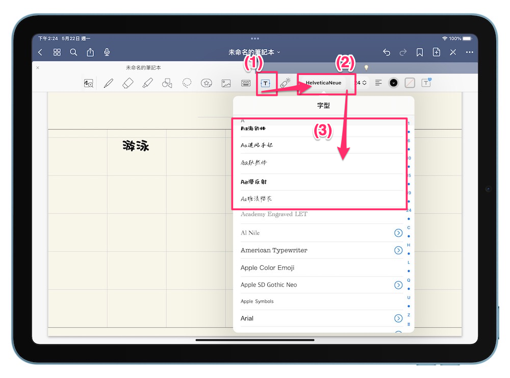 我們先用許多朋友使用的 GoodNotes 試試。可以發現當我們依照上述的三個步驟設定完後,就能在字體中出現剛剛所安裝的字體,然後我們只要在打完字後選擇我們安裝的字體來切換就可以。而且安裝的字體並不僅能在 GoodNotes 上使用,就算是 Apple 自家的無邊記中也能使用,讓不管是自己的筆記、學習計畫還是手繪日記、手繪食譜都更能呈現出自己想要的風格。