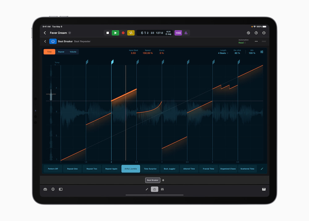 製作人可以切分與翻轉採樣、編排節拍和低音聲部,並使用節拍創作與製作工具打造自訂鼓組。利用全新時長與音高調整外掛程式 Beat Breaker,音樂創作者只需輕掃與兩指開合,就能徹底重塑並改變聲音。Quick Sampler 可透過切分和變換,將音訊採樣化為嶄新的可演奏樂器,Step Sequencer 則只需幾下輕點就能編排鼓點節奏、低音聲部和旋律,甚至實現外掛程式的自動執行。Drum Machine Designer 可在任意鼓組板上應用採樣和獨特的外掛程式,從而打造自訂鼓組。Live Loops 幫助使用者捕捉創作靈感,通過混音與搭配循環樂段,快速製作編曲。