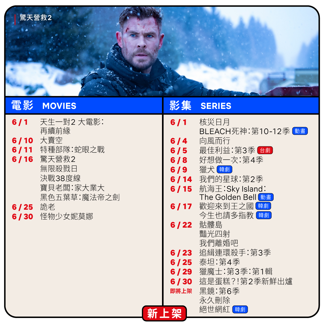 視劇圈兩大編劇強強聯手的《我們離婚吧》,還有克里斯·漢斯沃回鍋演出的《驚天營救 2 》,艾美獎肯定的《黑鏡:第 6 季》等好劇齊發,一起追起來!