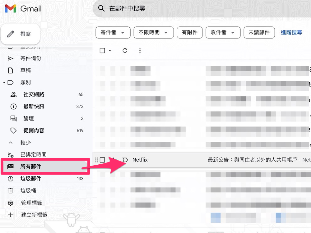 2、打開左邊的目錄,選擇「所有郵件」,雖然不會像剛剛那樣只列出被封存的郵件,但也列出了包含「封存」在內的所有郵件。