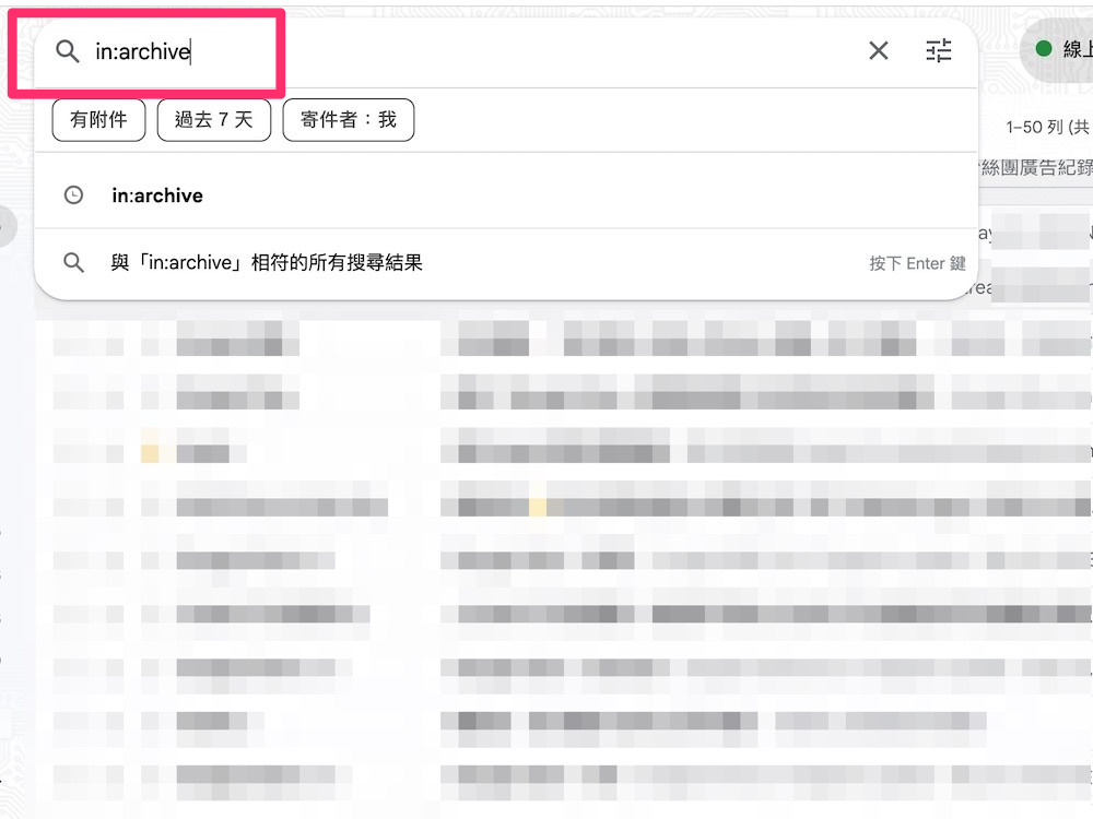 1、在上方搜尋列中輸入「in:archive」的指令。