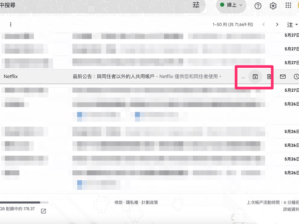 在郵件的標題旁邊,有一個畫著向下箭頭的資料夾,就是「封存」的圖示。我們可以從收件匣中郵件標題旁按下「封存」圖示,或是在郵件裡上方選擇「封存」圖示來將該信件藏起來。