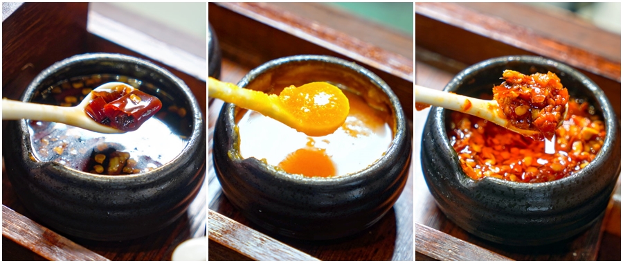 ▼由左而右分別為辣椒醬油、牛油、辣椒等,辣椒醬油有點類似四川泡椒的概念,可以搭配小菜、滷味享用,辣度不高但香氣十足,也可以增添一些鹹香氣息!牛油可以讓牛肉麵的湯頭更加厚實,香氣也非常濃烈~自製辣椒則是嗜辣者的最愛,如果覺得湯頭不夠辣的話也可以自行添加!