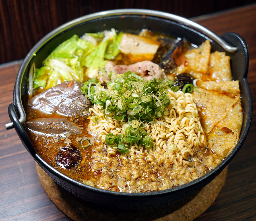 ▼麻辣牛肉鴨血豆腐鍋,這一鍋可說是份量十足,提起來沉甸甸的相當有重量;裡頭也是好料滿滿,有牛肉片、鴨血、豆腐、豆皮、米血、蔬菜、王子麵等配料,吃起來超有飽足感!
