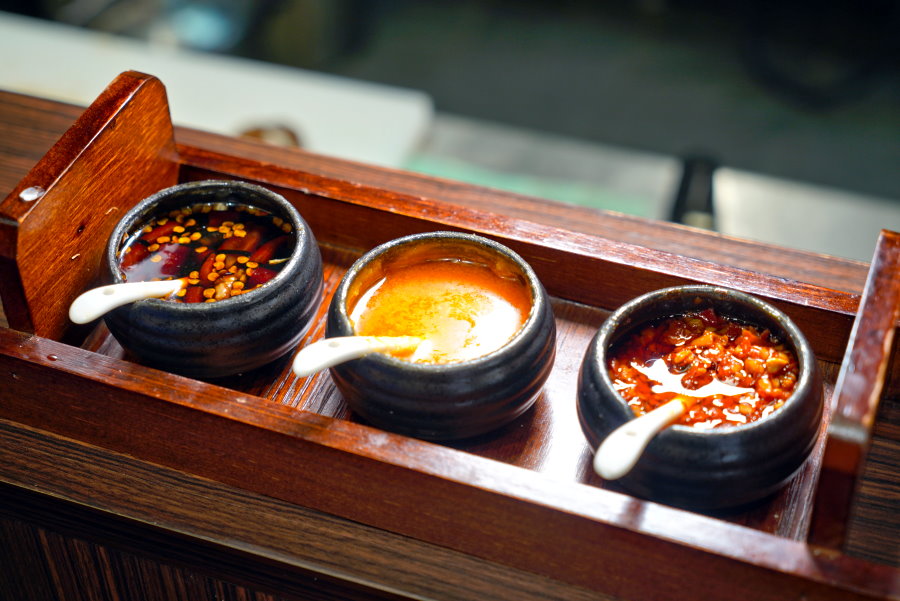 ▼一進來就能看到吧台用餐區、開放式廚房,可以看見師傅料理的過程,感覺也安心不少!店內也有醬料可供選購,喜歡香辣路線的朋友可以將左邊麻辣醬混合中間辣椒醬,喜歡又麻又辣的朋友可以直接買右邊那罐,吃起來保證過癮!